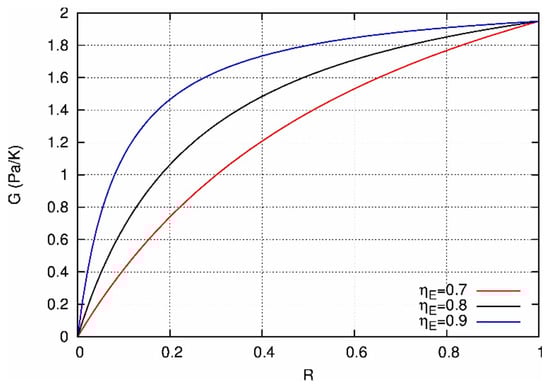 Dependence of the contrail factor G on the ratio R for parallel-hybrid-electric propulsion. is full fuel propulsion, is full electric propulsion. Parameters for the calculation have been , Q = 43.2 MJ/kg, hPa, and .