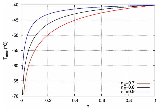 For the maximum temperature (,) ([], Equation (5)), at which contrail formation is possible, we studied the effects of various with respect to the fraction of electric power (see Figure 6). For a more efficient electric system with a high , it needs a relatively high electric share (R is very small) to achieve a substantial lowering of . In our example, the maximum temperature at which contrails can be formed when only liquid fuel is used () is −40 °C. To reduce this by 5 K, to achieve a maximum temperature of −45 °C, it needs roughly , or 70% of the thrust power needs to be provided by the electric motor when its efficiency is 0.8. For the smaller efficiency, the reduction in is larger. This may sound paradoxical, but it is the consequence of the simple physical fact that contrail formation is easier when the exhaust gas is colder, for what is higher combined overall propulsion efficiencies.