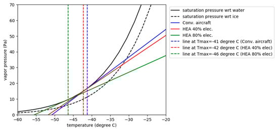 where p is the ambient pressure in Pa; ε is the ratio of the molar mass of water vapor and dry air (0.622 constant); is the isobaric heat capacity of air (1004 J/kg/K); Q is the lower heating value of fuel in MJ/kg; EIH2O is the water vapor emission index in kg/kg(fuel); and the notation () is the overall propulsion efficiency of the pure kerosene aircraft (reference), for which we assumed a value of 0.4 in the current study. This efficiency value was in line with the value computed using the aircraft/engine performance model presented in [].