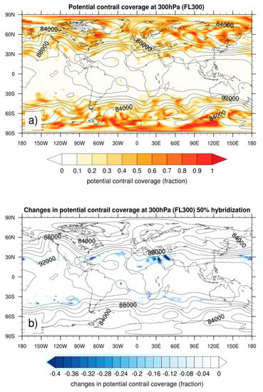 The potential contrail coverage (PCC) (contour) and geopotential (black contour; m2 s−2) at 300 hPa (FL300) on a specific day: (a) conventional aircraft; (b) absolute changes caused by HEA with 50% electric power.