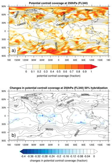 When increasing the flight altitude from 300 hPa to 250 hPa (FL340), for the conventional reference aircraft, we found the areas of potential contrail coverage in the tropical regions as well (Figure 9a). For HEA, with 50% of electric hybridization, the reduction of contrail formation was more pronounced in the tropical regions, as seen in Figure 9b.