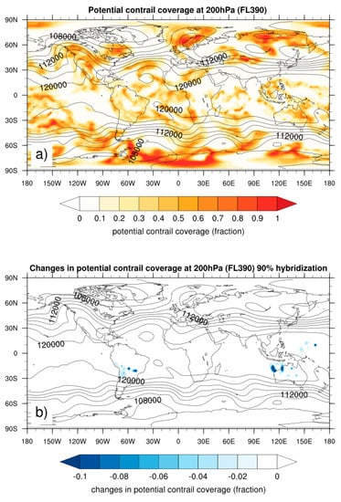 Figure 8a shows the PCC of conventional aircraft at 300 hPa (FL300) on a specific day. In contrast, the changes in PCC caused by 50% electric hybridization of HEA (i.e., R = 0.5 in Equation (3)) at the same altitude is given in Figure 8b. For the pure kerosene case, the contrails were mainly formed at the mid-latitudes and polar regions, where the local temperature was sufficiently low to form contrails. With 50% thrust power supplied by the battery, the reduction in contrail formation was observed at about 30° N and 40° S, where the tropopause climbed to the higher altitudes. The local temperature in this region was close to the temperature threshold for the pure kerosene aircraft. A transition to HEA lowered the temperature threshold by a few degrees Celsius. It was also noticeable that the contrail formation’s reduction was very much localized with a maximum value of around 0.4, which might have been related to the local temperature and humidity.