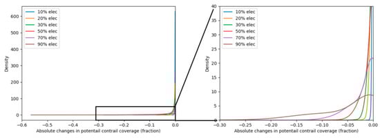In Figure 11, we present a statistical analysis of the local reduction of contrail coverage when different hybridization degrees were considered. The annual mean PCC was used. We observed that the contrail coverage remained nearly unchanged with a smaller fraction of electric power in use (less than 30%). As the hybridization rate increased from 10–90%, an exponential reduction trend was found, which was already indicated by the theoretical analysis in Figure 5 and Figure 6.