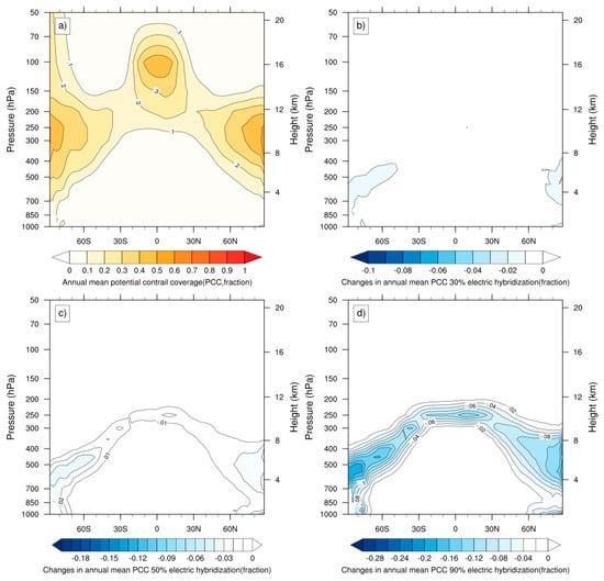 Annual zonal mean potential contrail coverage and changes due to electric hybridization: (a) conventional aircraft; (b) 30% electric hybridization; (c) 50% electric hybridization; (d) 90% electric hybridization.