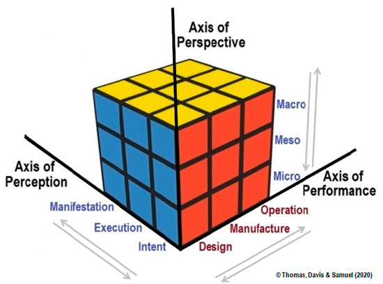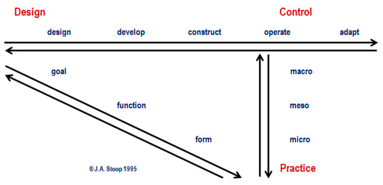 The “design-control-practice (DCP) diagram”, shown in Figure 4, was proposed by Stoop [15,16,17,18]. The DCP diagram is constructed of three sets of bi-directional arrows representing three axes. The macro-meso-micro levels of the vertical axis here represent the control levels of governance-oversight, management-control and operator-compliance respectively. The diagonal axis indicates the engineering design cycle of goal-function-form. It can be seen that both the vertical and diagonal axes of the DCP diagram have a one-to-one correspondence with the macro-meso-micro levels of ‘vertical integration’ derived from the concept of abstraction hierarchy (which in fact have different connotations in different system contexts), and represented by the ‘axis of perspective’ in the ‘Rubik’s cube model of integration-in-totality Principle’.