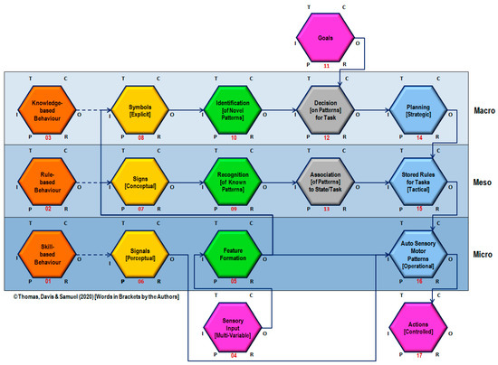 The authors further innovated and reframed the ‘SRK framework’ in the form of a “FRAMED-IN-FRAM® diagram” to bring in better clarity on how it is a reflection of the ‘axis of perspective’ of ‘vertical integration’ which is fundamental to the ‘integration-in-totality principle’. The FRAMED-IN-FRAM® diagram is an improved version of the functional resonance analysis method (FRAM) diagram [32], developed by the authors. Interested readers are referred to Thomas, et al. [1,2] for further information on the FRAMED-IN-FRAM® diagram. The FRAMED-IN-FRAM® diagram for the SRK framework, presented in Figure 6, shows how the behaviour and control, based on the three levels of skill, rule and knowledge, works through signals, signs and symbols of perceptual, conceptual and explicit nature respectively. It also illuminates how they work at the three organizational levels, viz. strategic, tactical, and operational levels, which correspond to the ‘macro-meso-macro’ levels respectively of the ‘Rubik’s cube model of integration-in-totality principle’.