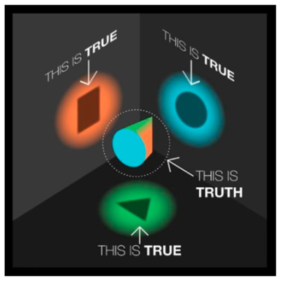 The role of perception in understanding the truth and reality is best exemplified by the story of “The Blind Men and the Elephant” from Indian folklore, wherein the same elephant was variedly interpreted to be a snake, spear, fan, tree, wall, and rope by the six blind men who touched the trunk, tusk, ear, leg, side and tail respectively. “Our perception of truth depends on our point of view”, writes Losmilzo [34] as a caption to the illustration shown in Figure 10, wherein “truth” is shown as a three-dimensional object which has shadows of square, circular and triangular shapes when projected in the three orthogonal directions, all of which are perceived as “true”.