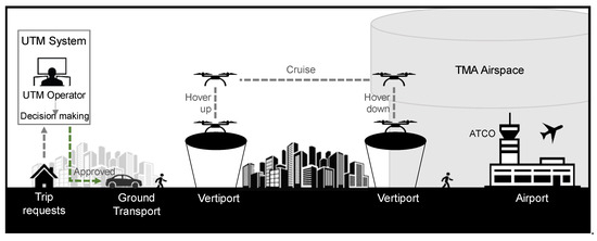 The emerging need to integrate Unmanned Aircraft Systems (UAS) traffic in the existing airspace bears notable challenges in terms of increased traffic density and complexity in low-altitude airspace [1,2]. In 2012, the Federal Aviation Administration’s (FAA) Modernization and Reform Act prompted research into the field of managing small UAS (sUAS) as civilian demand for these systems had grown significantly [3]. This initiative was pertinent to urban operations [4,5,6] and set foundations for successive research efforts in this field.