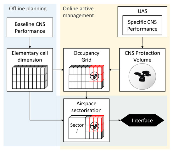 The proposed performance-based airspace model is conceptually illustrated in Figure 2. The model is underpinned by a two-stage approach. During the offline planning stage, the reference grid is generated as a set of elementary cells according to the baseline CNS performance. In our approach, the elementary cells are parameterized as cuboids with a square base, but the methodology could easily be extended to other 3D shapes. The length (), width () and height () of the cuboidal cells are formulated as a function of the expected baseline CNS performance for the region: