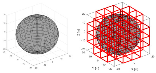 An occupancy grid can successively be derived from the set of elementary cells and from the active CNS protection volumes. Cells that are contained within and on the boundary of the protection volume correspond to occupied space and the remaining cells correspond to unoccupied space. This is also illustrated in Figure 2.
