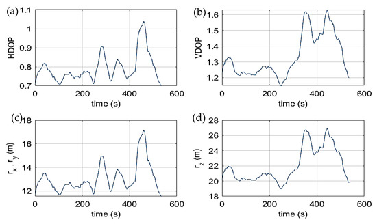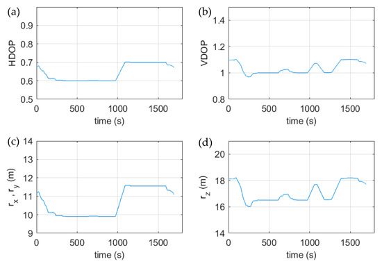 In addition to the errors in range measurement, accuracy is also dependent on the geometry of the satellites relative to the receiver. The effect of geometry on the accuracy of the solution is parameterized through a number of scalar factors termed the Dilution of Precision (DOP). The Position Dilution of Precision (PDOP) is the most commonly used factor and is presented in greater detail in [39]. The navigation position error is expressed in Equation (3), showing the relation of and PDOP. The maximum errors are chosen to capture the worst performance, representing the conservative case. The covariance matrix of the navigation position uncertainty is presented in Equation (4).