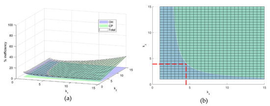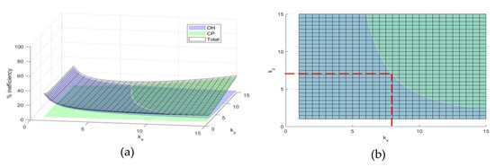 These inputs from Table 3 are fed into Equations (22)–(25). The values for the velocity are based on the specifications for the Airbus Pop.Up One [45]. Due to the dense population and small space in the urban area, the strict speed restriction is applied at the maximum of 10 m/s. The airspace sectorization results are presented in Figure 11. The inefficiency surface for the communication overhead (OH) and Computational Complexity (CP) are plotted. The optimum points lie on the intersection between these two surfaces: OH and CP (Figure 11a). The vertical sector dimension is derived to avoid overlap with the Terminal Area airspace (TMA) which begins from 457 m (1500 ft) and the base height of the over skyline starts at 330 m. Hence, the preferred is calculated from dividing the total heights of low-level airspace above skyline by the vertical dimension of the elementary cell (), . The optimal point is marked in red. Based on that, the value for is 8. The result from Figure 11b is the number of elementary cells in one sector as calculated from Equation (26): 448 cells.
