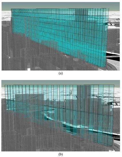 UAS PRV volume with occupancy grid in below skyline scenario (a) axonometric; (b) lateral view.