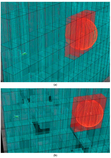 The protection volume and occupancy grid are illustrated in Figure 17. The resulting spherical CNS protection volume of an intruder and host UAS exceeds the below-skyline sector width (urban canyon width = 25 m). Consistently with our proposed two-way approach (Figure 4), this is a clear indication that the observed CNS performance is insufficient for safe navigation along the street and stricter CNS performance requirements are to be fulfilled to access such urban airspace portion. In future work, tailored directional inflations (in x, y, z) will be investigated, driven both by relative dynamics, weather, wake turbulence and other relevant factors.