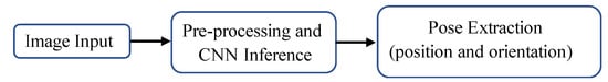 These additional algorithms have been based on image processing techniques while using hand-engineered features. Consequently, the pose is estimated utilizing the target’s image and its 3D model. However, such feature-based pose estimation is not scalable to spacecraft of different structural and physical properties. Improvements to such approaches have been proposed, with deep learning-based algorithms emerging as the preferred approaches. Such deep learning methods achieve pose estimation by two main ways. One approach is to discretize the pose space and solve the resulting classification problem. The other approach is to directly regress the relative pose from the input image. This becomes a regression problem for the deep learning network to solve. CNN-based algorithms that use single monochrome images for pose estimation have been studied with satisfactory results. Hirano, in [], demonstrates a CNN-based pose estimator for a spacecraft. The training data were obtained by use of a software simulator to generate synthesized images from a 3D model of the target object. This pose estimator directly estimates the 3D keypoints of the model from which the pose is determined. Sharma, in [], combines CNN with a Gauss–Newton algorithm. The CNN allows for feature detection without need for manual tuning of hyper-parameters whilst the Gauss-Newton algorithm provides the perspective equations for quantifying uncertainty in the estimated pose. Thaweerath et al. in [] presented a CNN-based pose estimation for noncooperative docking operations. The position and orientation were predicted by directly regressing them from the input image.