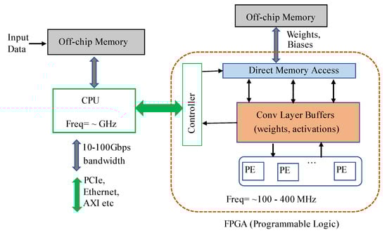 Wei et al., in [], implemented CNN on FPGA while using systolic array architecture for high throughput. This approach ensures low global data transfer since the processing elements (PEs) do not need to access the on-chip memory. Instead, connections are only required between different computation units for data transfer. This systolic architecture enables achievement of high frequency even in massive parallelization with hundreds of PEs. They also implemented an automated flow to map CNN architectures from high-level C code to FPGA, with no hardware-related, low-level considerations necessary for end-users. Lian et al. in [] implemented an FPGA-based CNN model by adopting an optimized block floating-point (BFP) arithmetic. The BFP is composed of a mantissa part, whose bit length is defined as 8 for typical CNN models, and an exponent part. Quantization involves both FP2BFP and BFP2FP conversions.