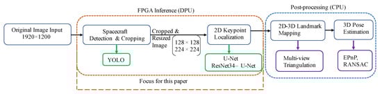 This work can further be developed in order to achieve an end-to-end FPGA-based spacecraft pose estimation. This will include interfacing to a real-time camera and performing the CPU-based algorithms for the final pose estimation tasks. The current implementation runs the two networks, YOLOv3 and ResNet34-U-Net, as standalone. The cropped images from the detection phase are stored in memory from which the DPU reads and runs them through the landmark localization phase. In an end-to-end implementation, these two phases would be coupled together. The inference time would be accurately measured in such an end-to-end implementation and it is estimated to be in tens of milliseconds that is consistent with other applications that have used Xilinx DPU in their designs.