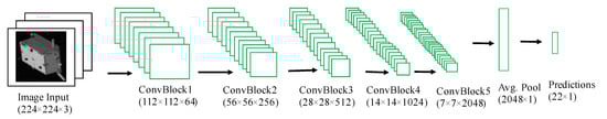 ResNet-50 model architecture is utilized in this approach. The SPEED dataset used in this evaluation has images with pixel size of 1920 × 1200. In this first approach, direct regression with no prior pre-processing, such as cropping, is adopted. The images are only resized to 224 × 224 to fit the input size of the ResNet model. This makes it more difficult for the network to detect as well as learn the spatial features of the spacecraft within such a small footprint. Nevertheless, the focus of this research is mainly based on the detection-based approaches that will be presented in the next sections. Because there are 11 keypoints, the network output needs an output vector of size 1 × 22. To achieve this, a global average pooling layer was added after the fifth block, before the output is finally fed into a fully connected (dense) layer with 22 units that gives the final keypoint predictions. Figure 4 depicts this network architecture.
