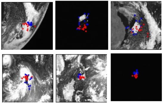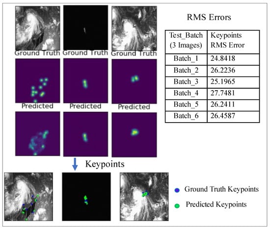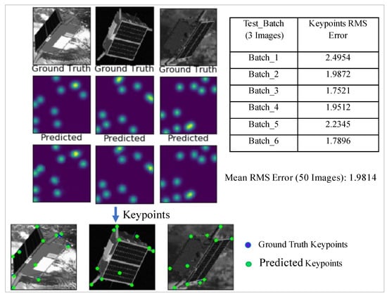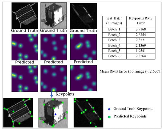 The image input is a cropped image that contains the spacecraft body as detected by the YOLO network in the preceding Section 3.2.3.1. The image is resized to 128 × 128 and fed into the U-Net model. This input size will determine the output dimensions. A large input size results in a corresponding high output resolution which leads to higher memory requirements during training. Hence, a compromise between the resolution and memory budget is required. The output resolution (and input image size) is chosen to be 128. The network is trained over 40 epochs in batches of 16 on Google Colab. The images in Figure 10 show the performance of the U-Net model in keypoint localization on cropped images. This performance on cropped images is greatly superior to the same model’s performance on uncropped images, as previously presented in Figure 7.