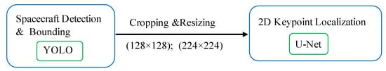 The main focus of this paper is on the inference for the CNN part of CNN-based pose estimation methods, as introduced in Section 3. To achieve high accuracy in pose estimates, a corresponding high accuracy in landmark detection is required. Hence, in this approach, a framework for achieving high accuracy in keypoint detection is presented. The performance of the keypoint detection is greatly increased by first detecting the spacecraft within the image. The spacecfraft within the image is first detected, as shown in Figure 8. The image is then cropped around the detected box and the keypoint detection network is run on this bounded/cropped image. This approach greatly increases the accuracy of the keypoint detection when compared to the preceding two approaches.