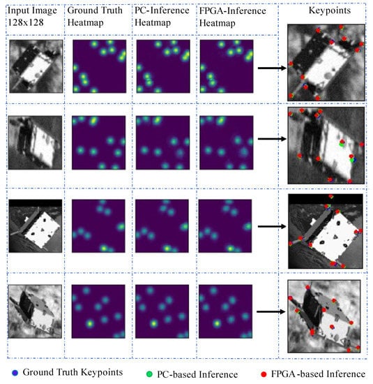 Table 7 presents the performance of the FPGA-based (8-bit quantized) inference as compared to PC-based (float) inference. It is shown that, although the inference on the MPSoC device is implemented with 8-bit quantization, there is no significant loss of accuracy from the PC-based implementation that uses 32-bit floats, with an average keypoint detection RMS error difference of less than 0.55. Hence, the hybrid Zynq MPSoC device is a viable candidate for implementing onboard inference in CNN-based spacecraft pose estimation algorithms.