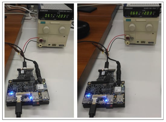 Power consumption is another key factor to consider for onboard inference in space applications. Table 9 shows the on-chip power consumption estimates for different DPU configurations as estimated using the Report Power tool in Vivado IDE. This is an estimate of the total on-chip power consumed internally within the MPSoC device. It does not include power consumed by other off-chip devices and peripherals on the Ultra96v2 board. Figure 18 shows the evaluation board power consumption with no inference and during inference. It can be seen that the board consumes about 6.84 W when no inference job is running and about 8.16 W during inference. Hence, it can be concluded that the inference task consumes approximately 1.32 W. However, in a real mission, the MPSoC chip will be incorporated on a custom PCB with only the necessary peripherals as opposed to the full-blown circuit on the evaluation board used in this work. Therefore, the power consumption for such a custom board will be significantly less than that of the Ultra96v2 evaluation board.