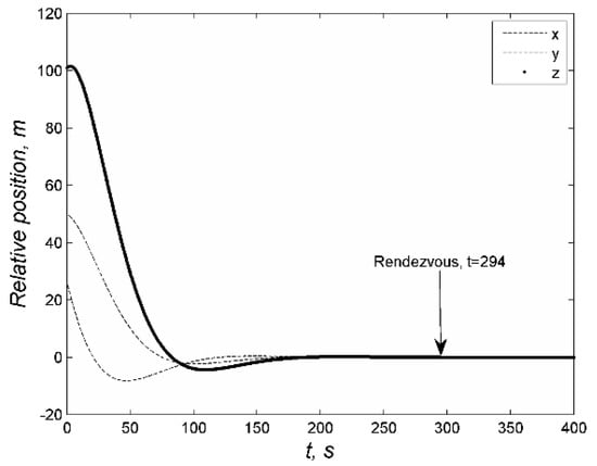 Further exploration of near-Earth space in the short term will become impossible without solving the problem of space debris removal. A number of international projects are aimed at its solution [,]. Space debris removal approaches can be divided into two classes: passive and active [,,]. In the case of passive approach the space debris are removed with the help of external natural forces, for example, aerodynamic drag in low Earth orbits [,], solar pressure [], ionospheric drag [] etc. Active removal of inactive spacecrafts and rocket stages often involves the use of special small satellites that can attach themselves on the space debris object or capture it with a manipulator [], net [,] or harpoon with tether [,], and change its orbit using the on-board motion control system. Active debris removal implies autonomous relative motion control in order to achieve relative state vector required for capturing. An onboard propulsion is often considered for the translational motion control and reaction wheels are for the attitude maneuvers. However, small satellites have restrictions on mass, size, energy, on-board computing power, and the composition of the control system equipment, which complicates the on-board control algorithms for the main modes of motion at the mission design stage, taking into account the limited capabilities of the satellites. The reaction wheels may experience saturation which must be avoided, the saturation may be caused by thruster misalignment or by high angular velocity of the tumbling debris. These situations may lead to the failure of the object capturing. That is why it is required to study the influence of the control system parameters on rendezvous and capturing maneuver capabilities.