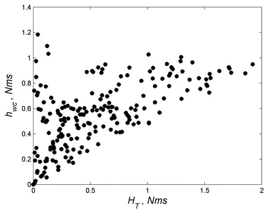 where  is inertia moment along principal axis,  is the ration coefficient for the inertia moment along axis of dynamical symmetry. According to physical constraint of the inertia moments . It is assumed that the inertia tensor of the target is known. In practical cases it is estimated at the stage of space debris observation, for example using image processing technique []. The target with dynamical symmetry is chosen for consideration because in that case it is easier to study the influence of the inertial moment of the target on control algorithm performance. Moreover, a lot of debris such as upper stages of rockets and some inactive satellites are close to body with dynamical symmetry. Taking all the parameters from the previous simulation example except the target inertia tensor, the maximal value of the reaction wheels momentum is calculated for changing ratio coefficient . The results are shown in Figure 9. It can be seen that the lowest maximal angular momentum is close to the case when  that correspond to spherical body. In the case when the body has a dynamical symmetry the more the ratio coefficient of matrix of inertia, the higher the maximal angular momentum of the reaction wheels. It can be explained by the increasing influence of the nutation motion of the body, the capturing point of the target position is harder to track by the reaction wheels of the chaser. To further study the influence of nutation motion on the control algorithm performance, the initial angular velocity is also varied. For the random ratio  from the interval  and for the random initial angular velocity of the target (each component value is chosen from interval ) after simulation the maximum value of the reaction wheels momentum is obtained. Figure 10 shows these points for each simulation and corresponding values of maximum angular momentum which is required to be provided by reaction wheels. Almost all of the maximal values of the reaction wheels are less than 1 Nms, that is assumed to be the upper limit. However, in the case the angular velocity is higher that  deg/s the wheels saturation often occurs that causes the inappropriate errors for the capturing.