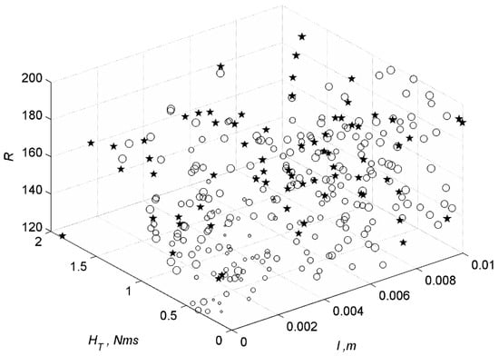 The reaction wheels saturation can be also caused by thruster misalignment. To study its effect on the capturing the random misalignment  m is added to simulations additionally to the varying parameters  and angular velocity of the target. Moreover, the control parameter weighting matrix  affects the required angular momentum of reaction wheel, consequently the changing elements of  are added as well to the simulation alongside other varying parameters. The results of multiple simulations are presented in the Figure 11 in the parameters ranges, where bubbles mean that there is no saturation and the capturing is successful, and the stars are for capturing the failure due to reaction wheels saturation. The smaller the bubbles the less the maximal angular momentum of the reactions wheels.