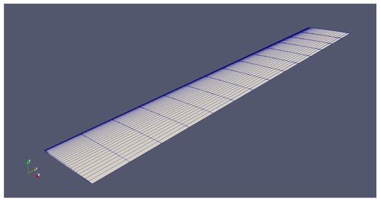 Following previous works [], the wing structure is modelled with CBEAM elements and accounts for the distance between inertial and elastic axes; the node lying at the wing root is then clamped (see Figure 1). Further FEM nodes are placed at the leading and trailing edges of the wing and connected to the beam nodes with the rigid elements RBE2, in order to support mapping with the aerodynamic grid (in terms of both structural deformation and aerodynamic load: the latter modifies the former, which changes the airflow boundary condition in turn) according to the closely-spaced rigid diaphragm (CSRD) assumption []. For the natural vibration analysis, shear deformation is neglected in order to obtain the Euler–Bernoulli beam model, with PBEAM defining the properties (i.e., inertia and stiffness) of the beam element and SPC1 defining the single-point constraint for the clamped root. Using Nastran’s SOL103 to obtain the structural eigenvalues and eigenvectors, the vibration analysis is performed while selecting Lanczos’ method [] as available in EIGRL and normalising the modes to unit values of the generalised mass.