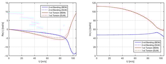 In order to elaborate on the literature results and visualise the flutter mechanism, the aeroelastic stability analysis of Loring’s wings is first performed with the same assumptions as in the original publication and the approach here described in the Problem Formulation; the  method (with Theodorsen’s exact function []) has consistently been used and results have been cross-verified against the state-space representation (with a common two-term RFA of Theodorsen’s function) []. By employing the first two bending modes and the first torsion mode, the respective coupled vibration frequencies are calculated as 1.21, 7.59 and 17.91 Hz; once still coupled with two-dimensional unsteady aerodynamics for a flat plate using standard strip theory, flutter is consistently predicted at 91.15 m/s and 9.2 Hz (which is indeed an excellent approximation, as confirmed by a modal convergence study up to the first three bending and torsion modes). The evolution of the aeroelastic system’s eigenvalues is presented in Figure 3 and confirms static divergence to arise well beyond dynamic flutter (i.e., ).