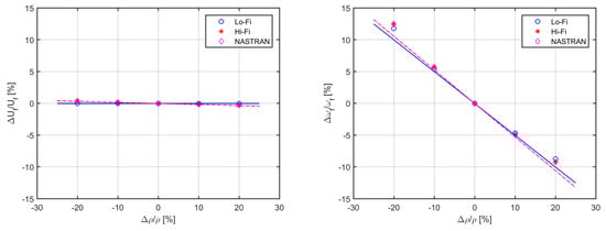 From Figure 6, it can be seen that changing the wing’s material density alters all natural frequencies through the inertial properties and hence the flutter frequency, but has marginal/no influence on the flutter speed; all symbols give the actual nonlinear percentage variation of the flutter point, whereas all lines with corresponding colour draw its normalised linear prediction. In particular, a  increment in the material density causes about a  decrement in the flutter frequency; the negligible variation of the flutter speed is confirmed by previous works [] as being due to the (small) beneficial effect of an increase in sectional mass being compensated by an (almost) equal and opposite detrimental effect of an increase in mass moment of inertia. This outcome may indeed help while minimising the aeroplane weight, as reducing the material density does not significantly affect the present flutter boundary due to wing bending–torsion instability (especially in the absence of lumped masses). However, it shall be recalled that varying the wing inertia might cause other types of aero-structural instabilities to arise at the aircraft level due to modal coalescence, and monitoring the variation of the flutter frequency is then important to preventing potential resonance. It is also worth mentioning that the small higher-fidelity effect on the flutter speed is due to the unsteady airload being frequency dependent through the lift-deficiency function and the related aerodynamic lag.