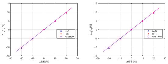 As per Figure 7, changing the wing’s material elastic modulus alters all natural frequencies through the stiffness properties and hence the flutter speed and frequency; in particular, a  increment in the elastic modulus induces about a  increment in all the latter, leaving the flutter reduced frequency practically unchanged. This outcome is quantitatively confirmed by previous works [] as being due to the detrimental effect of an increase in flexural stiffness being much lower than the beneficial effect of an increase in torsional stiffness. The striking agreement between lower and higher-fidelity results is mostly driven by the respective structural models being equivalent (as seen from the close agreement between the natural vibration frequencies), while the different aerodynamics play a minor role (as the airflow is moderately unsteady). The quasi-linear trend of the percentage variations reveals a rather large confidence interval for the normalised sensitivity; however, the dimensional counterpart of the latter to be used by optimisation routines follows a highly nonlinear pattern (note that the explicit lower-fidelity expression given in Appendix A for the torsional static divergence speed provides a straightforward theoretical check).