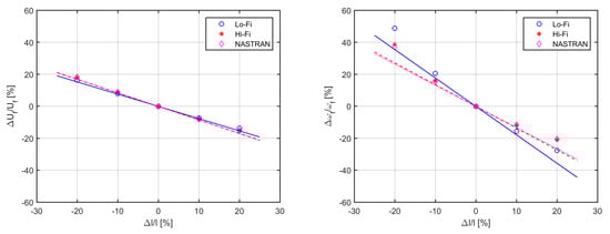 Finally, Figure 8 shows that changing the wing semispan has a large effect on the stability boundary through the stiffness properties as well as the aerodynamic loads and hence on the flutter speed and frequency. In particular, a  increment in the wing semispan induces about a  decrement in the critical speeds and about a  decrement in the flutter frequency; note that analogous trends for the variations and orders of magnitude for the sensitivities were obtained in previous studies on similar slender wings [], as a qualitative means of validation. Lower and higher-fidelity results are still in very good agreement and differences are mainly due to unsteady downwash effect, as the aspect ratio of the wing changes considerably with the span and so does the sectional airload.