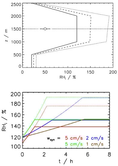 Three different synoptic scale updraught scenarios with either or are prescribed. By adjusting the updraught period, the prescribed final adiabatic cooling is either or and corresponds to an uplift of roughly or , respectively. Table 2 summarises the updraught velocities and durations of the various scenarios. The temporal evolution of the background relative humidity at is shown in Figure 1 bottom. Three cases with and one case with are selected for display. In the scenarios, the peak RHi is around or depending on . This is below or close to the threshold humidity where homogeneous nucleation starts. We deliberately switch off homogeneous nucleation in the scenarios (otherwise ICs might form in parts of the domain where turbulent fluctuations create RHi values above the threshold) and hence contrails are the only cloud type in those simulations. In the scenarios, the ambient relative humidity rises well beyond the nucleation threshold and natural cirrus is allowed to form around the contrail. Homogeneous nucleation is initiated preferentially at the top of the supersaturated layer where the nucleation threshold humidity of is surpassed first. The onset of cirrus formation depends on (and to a lesser degree on ) and is listed in Table 2. During the cirrus formation stage, up to SIPs are generated to resolve the highly non-linear ice nucleation process. The stochastic nucleation implementation and an SIP merging technique as described in Unterstrasser and Sölch [] are employed to increase numerical efficiency. In the very slow updraught scenario with natural cirrus would form late in the simulated period and would not affect much the contrail evolution. Hence, cooling cases are only run for or .