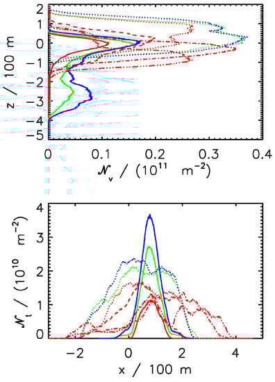 Figure 2 shows contrail IC number profiles in vertical (left) and transverse (right) direction. From the contrail profiles the contrail width W and vertical extent H are inferred and the values are also listed in Table 3 (columns 1 and 2). The solid curves shows the SA cases, where the contrail can extend up to below the flight altitude (in this plot is identified with the flight altitude). For , the contrail is considerably thinner since basically all ICs that were trapped in the downward sinking vortex system sublimate completely. In the FF scenarios, the contrail vertical extent ranges between and and is substantially smaller than for fully grown classical contrails. On the other hand, FF contrails are broader than SA contrails (400–600 m vs. 150–250 m). Moreover, large parts of the FF contrail can lie above cruise altitude. For this reason, the contrail is chosen to be located in the middle of the ISS layer in the contrail-cirrus simulations. If we had used the standard setup of Unterstrasser et al. [] with , the FF would penetrate into the transition zone, which is not desirable for a meaningful comparison between SA- and FF cases. Moreover, the various red lines illustrate the FF contrail sensitivity to parameters of the formation geometry, namely the lateral offset of the two AC in formation.