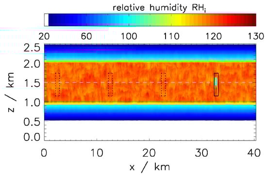 Next, we will shortly describe the technical procedure of how to incorporate the vortex phase simulation data in the model domain. The Eulerian 3D data (e.g., velocity (), perturbations of water vapour concentration and potential temperature ) are averaged along flight direction and interpolated on the coarser grid and embedded into the enlarged 2D model domain. Lagrangian SIP data contain the information of the ICs and SIPs with similar positions (neglecting the coordinate y along flight direction) and IC sizes are merged. This reduces their overall number from several tens of millions in the 3D simulations to around in the present approach. Unterstrasser and Sölch [] showed that contrail-cirrus is sufficiently well represented by SIPs for the type of analysis carried out in this study. Figure 3 exemplarily displays an initial 2D field, where the black box encompasses the area in which the 3D vortex phase data was inserted. In this example, relative humidity is shown. The RHi values in the contrail are apparently lower than in the supersaturated environment, where the local RHi values fluctuate around .