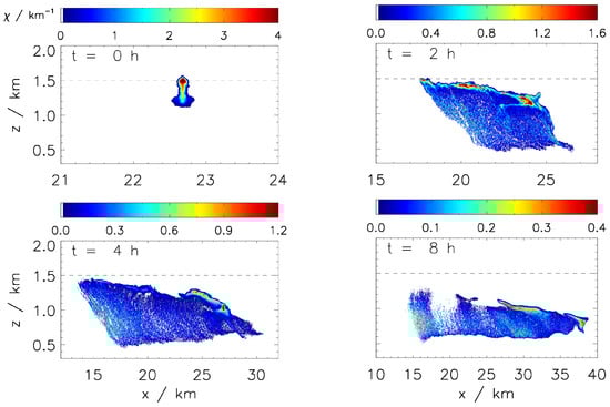 First, we present snapshots of an exemplary SA simulation which show the CC cross-sections at initialisation and after 2, 4 and 8 h (Figure 4). The figure displays the extinction coefficient . The atmospheric conditions are and . Here, the simulation time h refers to a 5 min old contrail, cf. with Figure 1 of Unterstrasser []. The initial contrail is more than 450 m deep and nearly 300 m broad. The contrail is broadest in the lower part, where the Crow instability [] leads to oscillations of the vortex tube along flight direction (over which is averaged here). Due to the prescribed wind shear, the CC gets tilted and spreads horizontally over time. The largest ICs start to settle and fall out from the tilted CC. A fall streak shapes up, with extinction values that are smaller than in the CC core region, i.e., the thin top layer with much higher values. The CC core region features high IC number densities and the fall streak is continuously fed by ICs that keep falling out of the CC core. Below the ISS layer, i.e., , ICs shrink until they completely sublimate. Apparently, they disappear prior to reaching the lower domain boundary; we consider those ICs to be lost by sedimentation even though they are actually lost by sublimation. After 2 and 4 h, the width of the fully-grown CC attains values of 9 km and 17 km, respectively. The last snapshot after 8 h shows a decayed CC and the values are much smaller. A more detailed discussion of the CC evolution and its response to variations of the atmospheric background can be found in [,,,,].