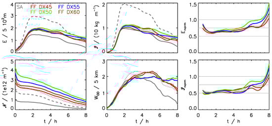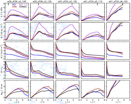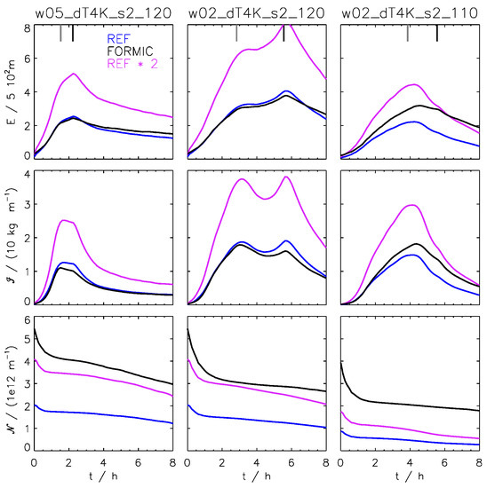If is reduced (columns 1 to 3), the peak and final values of E are higher, maximum CC width is larger, more ICs are lost in the first hour, for h, however, the loss rates are smaller as fewer ICs are lost by sedimentation. If is reduced (column 3 vs. 4), the lower IC number remains over the total simulation period. Similarly, all other quantities also attain smaller values for smaller . There are two reasons for this behaviour. First, the amount of supplied WV is smaller by one quarter, as can be derived from the values listed in Table 2 (). Second, shear-induced horizontal spreading is less effective for an initially shallower CC.