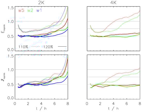 So far, scenarios with have been discussed. Next, simulations with , where the formation of natural cirrus is allowed, are presented. To shorten the description only and are depicted in Figure 6. A detailed analysis of how CC and natural cirrus interact on a local scale and how CC evolution is affected by natural cirrus formation is given in Unterstrasser et al. [] and the reader is referred to this paper for a deeper understanding. Inside the CC, relative humidity is too low to support nucleation of new ICs. ICs form only outside of the CC, once RHi surpasses of nucleation. Natural cirrus surrounds the CC and depletes WV in the vicinity of the CC. This confines the CC growth at its periphery. On the other hand, the sustained ascent continues to make more WV available inside the CC. Hence, in this region IC growth is stronger relative to the scenarios. These two counteracting effects lead apparently to the result that the E- and evolutions do not differ much between a simulation and its respective counterpart (compare, e.g., first columns in Figure 5 and Figure 6). Below the tilted CC, natural cirrus has been depleting the WV. This weakens the formation of the CC fall streak, as the contrail ice crystal do not grow as fast and sediment more slowly. For this reason, we find the number of ICs to decrease more slowly in the scenario as fewer ICs are lost by sedimentation.