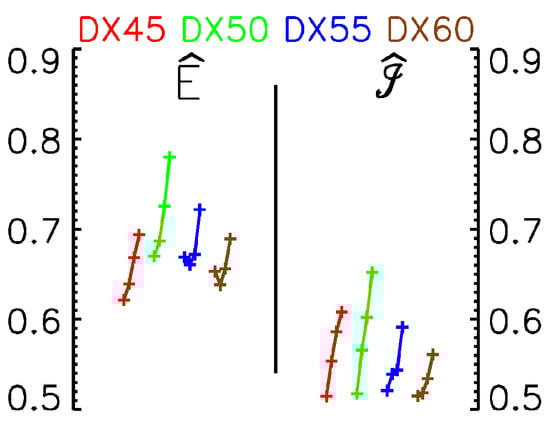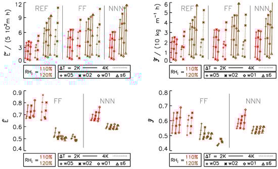 Figure 7 shows again E and , but now in a normalized version. For this, the FF simulation results are normalized by the “2 * REF” values, e.g, a value of 0.75 means that the “strength” of a contrail produced by an aircraft in a formation is only of that by the same aircraft on a single mission. The added value of the normalized version is manifold. The compact form allows to include the complete set of investigated atmospheric scenarios, simplifies the comparison between FF and REF and nicely summarises conclusions made before. Furthermore, finally, it enables a quantitative comparison.