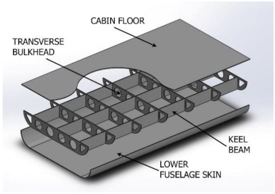 The subfloor is a box structure integrated in the fuselage belly, made of keel beams and transverse bulkheads, as shown in Figure 2.