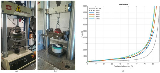 The curves shown in Figure 6c report the load as a function of the normalized deflection of the foam specimens, i.e., the deflection divided by the undeformed thickness of the specimens; the deflection during the static and low-speed tests was measured with the linear variable displacement transducer (LVDT) integrated in the hydraulic press, while during the dynamic tests, it was calculated by double integration of the acceleration signal from the dropping mass.