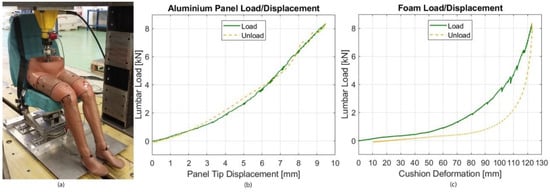 Even if most of the deformation is developed by the seat stroke and cushion, the seat pan stiffness may play an important role on the dummy response and its lumbar spine load, due to possible dynamic coupling. Therefore, an additional static test was carried out, in order to retrieve two force–displacement relations: the first one refers to the set including the bottom part of the dummy (in contact with the cushion) and the cushion itself and the other one represents the elastic response of the seat pan. The test consisted in the application of a force through the dummy to the seat, in quasi-static conditions: measuring the cushion deformation and the displacement of the forward tip of the seat pan, it was possible to relate the applied force and the two resultant displacements. The tested assembly, shown in Figure 7a, included only the seat without absorbers (the moveable bucket was blocked along the tracks to prevent its stroke) and the lower part of the ATD from the pelvis to the feet. The subfloor was completely removed, except the upper plate on which the seat was constrained.