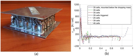 The blocks were all 150 mm high, but they were cut in different lengths and widths in the range 100–200 mm; in other words, they were made by a different number of cells. Two aluminum sheets, 1 mm thick each, were glued on the top and bottom sides of each block: this can be seen in Figure 8a, showing a tested specimen. Some of the blocks were statically triggered to reduce the initial peak. Figure 8b shows a synthesis of the most relevant results, where the load σcell is normalized to the actual number of cells of each honeycomb block and the displacement ε is normalized to the 150 mm height of the specimens.