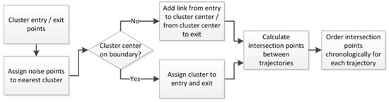 For clustering trajectories, parts of trajectories, or waypoints an appropriate clustering algorithm must be selected. In general, clustering algorithms [12] can be assigned to different techniques such as partition or distance-based clustering, density-based clustering [9], Ref. [4,8] or hierarchical clustering such as HDBSCAN [13]. The well-known k-means algorithm and its variants [14] are distance-based clustering techniques. Widespread density-based clustering algorithms are based on DBSCAN (Density-Based Spatial Clustering of Applications with Noise) [15]. Spectral clustering [16] or the OPTICS (Ordering points to identify the clustering structure) algorithm [17] are also density-based clustering algorithms showing good results in case of data sets with varying densities. As introduced in [3], we use a DBSCAN to cluster intersections of trajectories instead of trajectories or segments thereof.