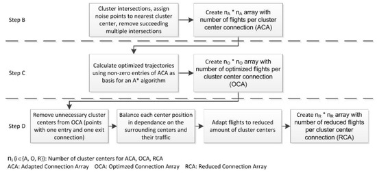 To build the main-flow structure, an array consisting of elements, with denoting the amount of cluster centers for the adapted main-flow network, is build (step B). In this array, the number of flights using the links between a pair of cluster centers is stored based on the selected flight sample. This Adapted Connection Array (ACA) can be interpreted as a list of all allowed connections between cluster centers and is used to calculate the main flows.