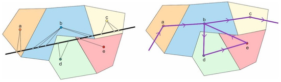 The algorithm [18] is a generalization of the Dijkstra algorithm. This pathfinding algorithm uses problem dependent information to estimate path costs. It operates on a weighted graph where the sum of costs (here the edge length) counted by moving through the network from a given origin to a destination is used as objective function. This algorithm tests those nodes first which seem to be most promising, e.g., because they are very close. For each possible node, the cost to reach this node from the origin plus the estimated cost to move from this node to the destination are calculated (. For , the length of the direct connection from the observed point to the destination is used as estimation. This is carried out until the destination is reached.