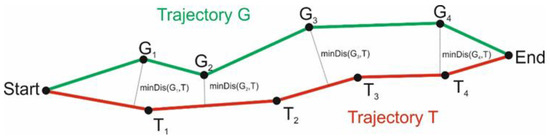 The SSPD metric [10] is used to evaluate the closeness between the actual flight trajectories and the artificial routes created by the trajectory clustering process. Therefore, the minimal distances for all points of trajectory G to the segments of trajectory T (Figure 6) are calculated. The average of these values determines the Segment-Path distance. For the SSPD, this is carried out for both trajectories and the sum is averaged. With this metric the route length of the flown trajectories can be compared with the route length of the artificial trajectory.