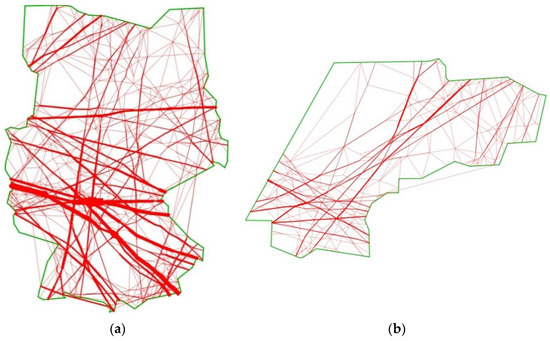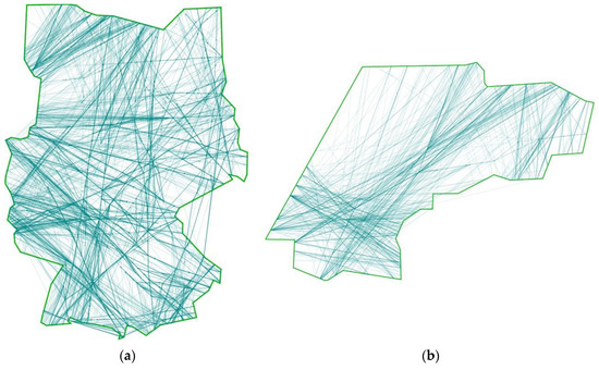 The goal of these samples is to investigate how close a main-flow network created with the presented approach reflects the as-flown trajectories and to evaluate the influence of the optimization on a network’s structural complexity. As sample areas, the German airspace boundary (Scenario 1) and the EDYYDUTA area (Scenario 2) were selected together with appropriate traffic samples (Figure 9). EDYYDUTA includes airspace areas over the northern sea with less traffic. Both samples consist of a set of flight trajectories based on real traffic of 12 July 2012, selected from DDR2 data of EUROCONTROL [25] and restricted to flight level 320 and above. It is obvious that the trajectories of the real traffic sample are often very similar, leading to intersections which are very close to each other. However, they do not adhere in general to the published route structure. Instead, many direct routings can be identified.